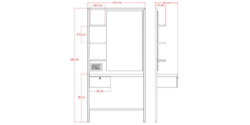 Coiffeuse murale en bois clair ou bois foncé avec éléments en bois foncé ou clair équipée d'un éclairage LED, prises électriques et ports USB