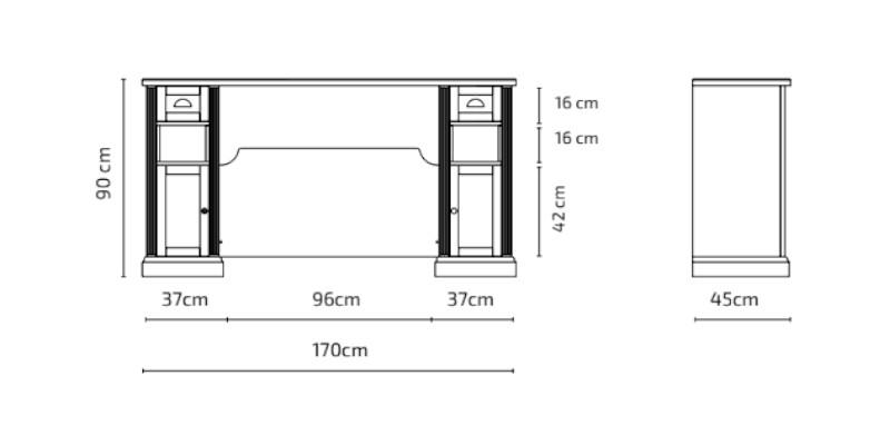 Meuble de coiffure vintage et élégant composé d'un long plateau et de nombreux rangements